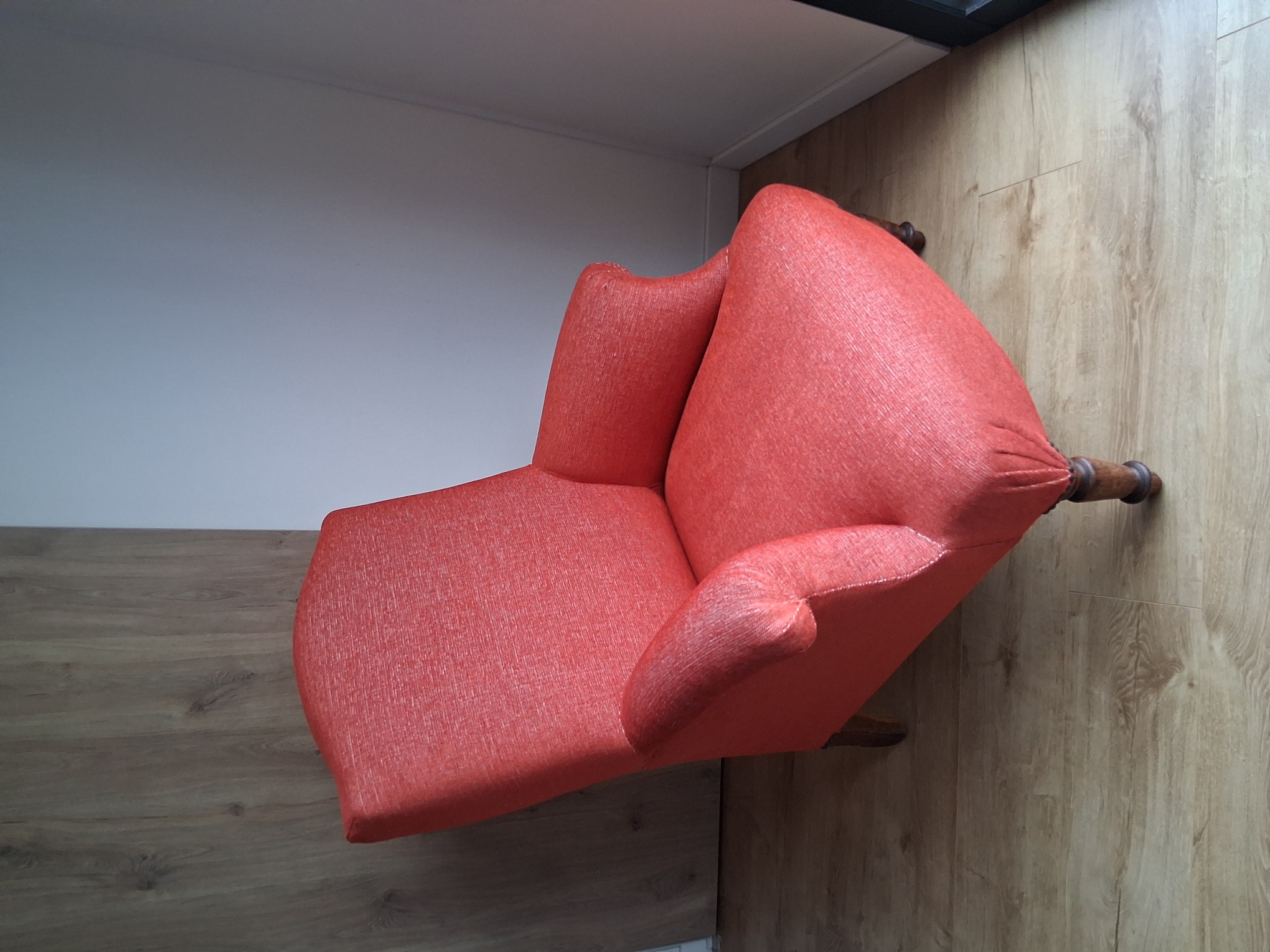 Le choix d’un tissu orangé de chez Casal apporte chaleur et modernité. Cette teinte lumineuse permet au fauteuil de s’intégrer harmonieusement à l’intérieur de mes clients, tout en affirmant son caractère.