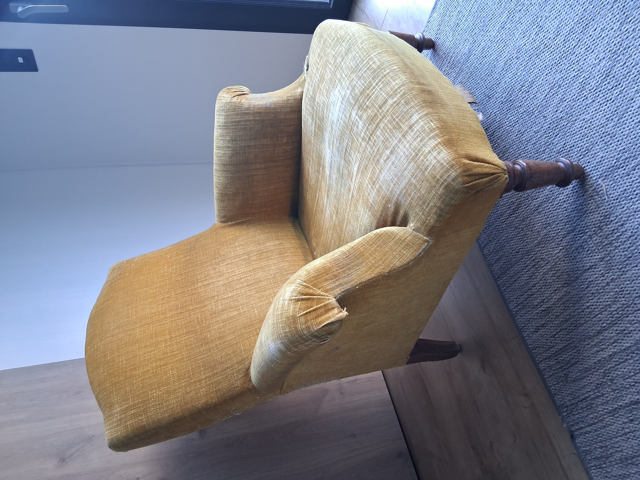 Ce fauteuil anglais, transmis depuis plusieurs générations, porte les traces du temps et des nombreuses réfections passées. Malgré l’usure, il conservait toute la prestance et l’élégance caractéristiques du mobilier anglais